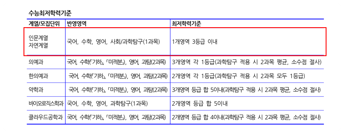 수능최저학력기준을 보면, 모집단위에 따라 요구 수준이 매우 뚜렷하게 구분되는 구조임을 알 수 있습니다. 가장 먼저 인문계열과 자연계열 일반 모집단위를 보면, 국어·수학·영어·사회/과학탐구(1과목) 가운데 단 1개 영역만 3등급 이내를 충족하면 되는 방식입니다. 이는 약술형 논술을 준비하는 중위권 수험생에게 상당히 진입장벽이 낮은 조건으로, 특정 과목 하나만 안정권이면 수능 부담 없이 지원이 가능한 구조라고 볼 수 있습니다. 특히 탐구 또는 영어 한 과목에 강점이 있는 학생이라면 현실적인 수시 카드로 활용하기에 적합합니다. 다만 불수능 또는 물수능이라는 말이 있듯이 성적 변동성에 특히 유의해야합니다.