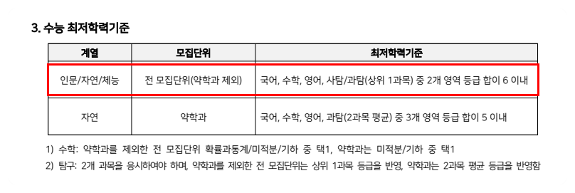 종합적으로 보면, 약학과를 제외한 인문·자연·체능 계열은 수능 최저 기준이 비교적 완화되어 있어 논술고사에 집중하면서도 수능을 ‘보조 수단’으로 활용할 수 있는 구조입니다. 반면 약학과는 수능 성적 자체가 합격의 전제 조건에 가까운 강한 최저를 적용하고 있어, 수능 중심의 상위권 학생에게만 현실적인 선택지라고 정리할 수 있습니다. 결국 동일한 전형 안에서도 모집단위에 따라 요구되는 수능 전략의 무게감이 얼마나 달라지는지를 분명하게 보여주는 기준이라고 볼 수 있습니다.